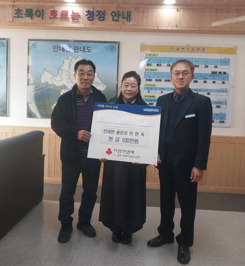 In Hyun-ok, a resident of Yongchon-ri, Annae-myeon, Okcheon County, donated 1 million won to the Chungbuk Community Chest of Korea at a "Neighborhood Donation Ceremony" held at the Annae-myeon mayor's office on the 13th.
