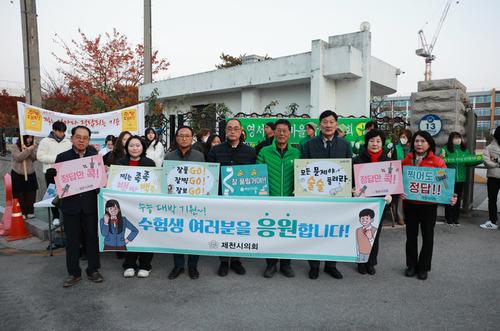【충북 브레이크뉴스】임창용 기자=제천시의회는 13일 오전, 2026학년도 대학수학능력시험을 치르는 지역 수험생들을 응원하기 위해 제천여자고등학교, 제천제일고등학교, 제천고등학교 등 관내 3개 시험장을 차례로 방문했다.