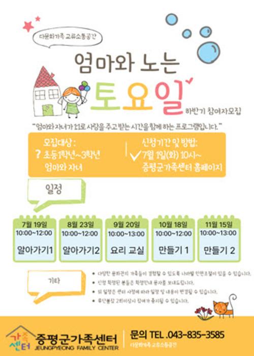 【충북 브레이크뉴스】김봉수 기자=증평군가족센터가 초등학교 저학년(1~3학년) 자녀와 엄마가 함께 소통하고 유대감을 키울 수 있는 주말 프로그램 ‘엄마와 노는 토요일’ 하반기 참여 가족 12팀을 모집한다.