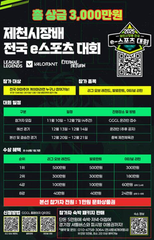 한편 제천시장배 전국 e-스포츠대회는 2023년 3천여 명이 참여한 가운데 첫 대회를 치른 이후, 2024년에는 선수단과 관람객 4천 4백여 명이 참여하는 등 전국 규모 대회로 성장했다. 올해 3회째를 맞이한 이번 대회는 총상금 3천만 원 규모의 명실상부 중부권 최대 아마추어 e-스포츠 대회로 자리매김했다.